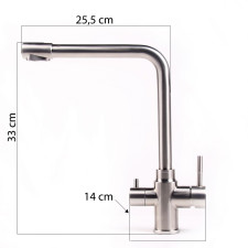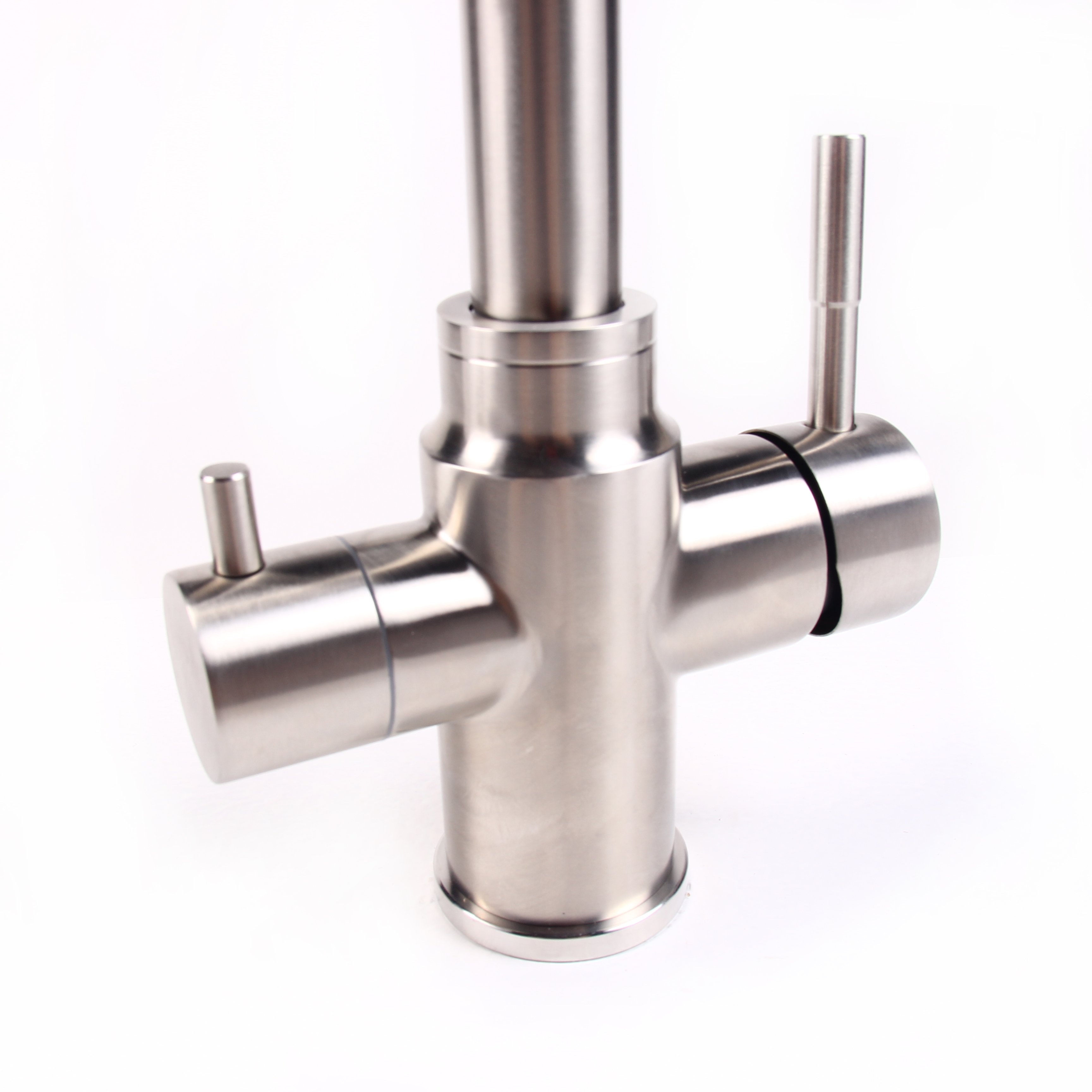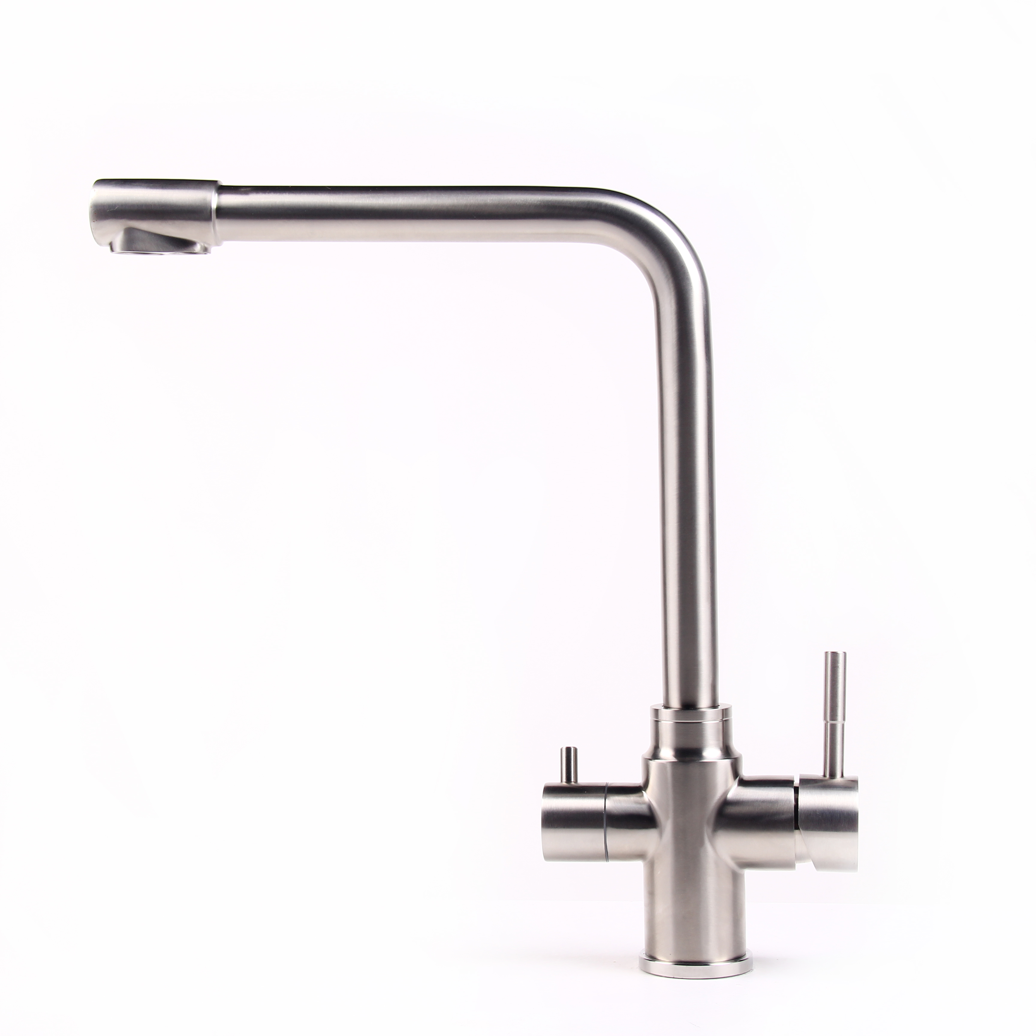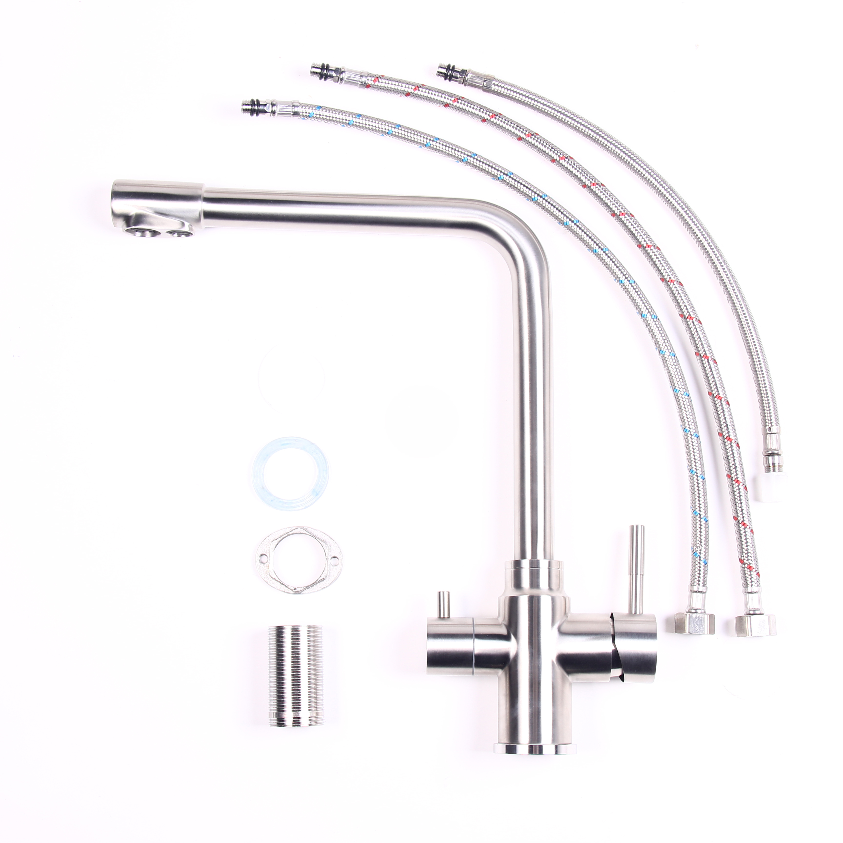 Metallist korpus tagab maksimaalse vastupidavuse.Tugev messingist korpus tagab vastupidavuse ja pikema eluea. Kõrgkvaliteetne poleeritud kroomitud viimistlus, mis takistab igapäevasest kasutamisest tingitud tuhmumist ja korrosiooni. Komplekti kuulub 3x paindlik segisti ühendus, kraan ja kraanigaator. Lihtne paigaldada. Kahekordne veepihusti disain. Üks kuum / külm vesi, teine on puhas vesi. Eemaldab filtreeritud vee jaoks eraldi joogi kraani.