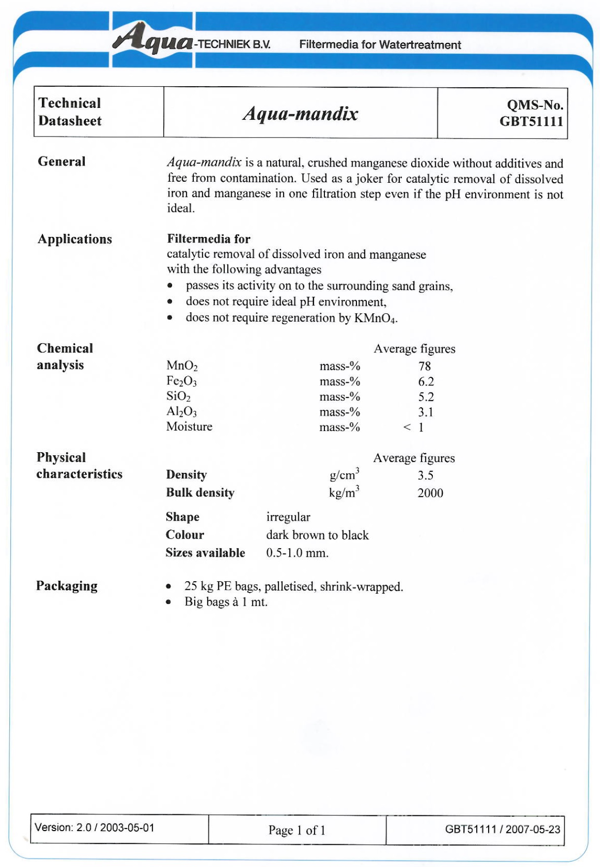 Aqua-mandix is a natural, crushed manganese dioxide without additives and free from contamination. Used as a joker for catalytic removal of dissolved iron and manganese in one filtration step. The product will do a very good job already at pH 6,5 and even in presence of NH4. Aqua-mandix will also remove "parts of" As, Al and H2S if present next to Fe and Mn.