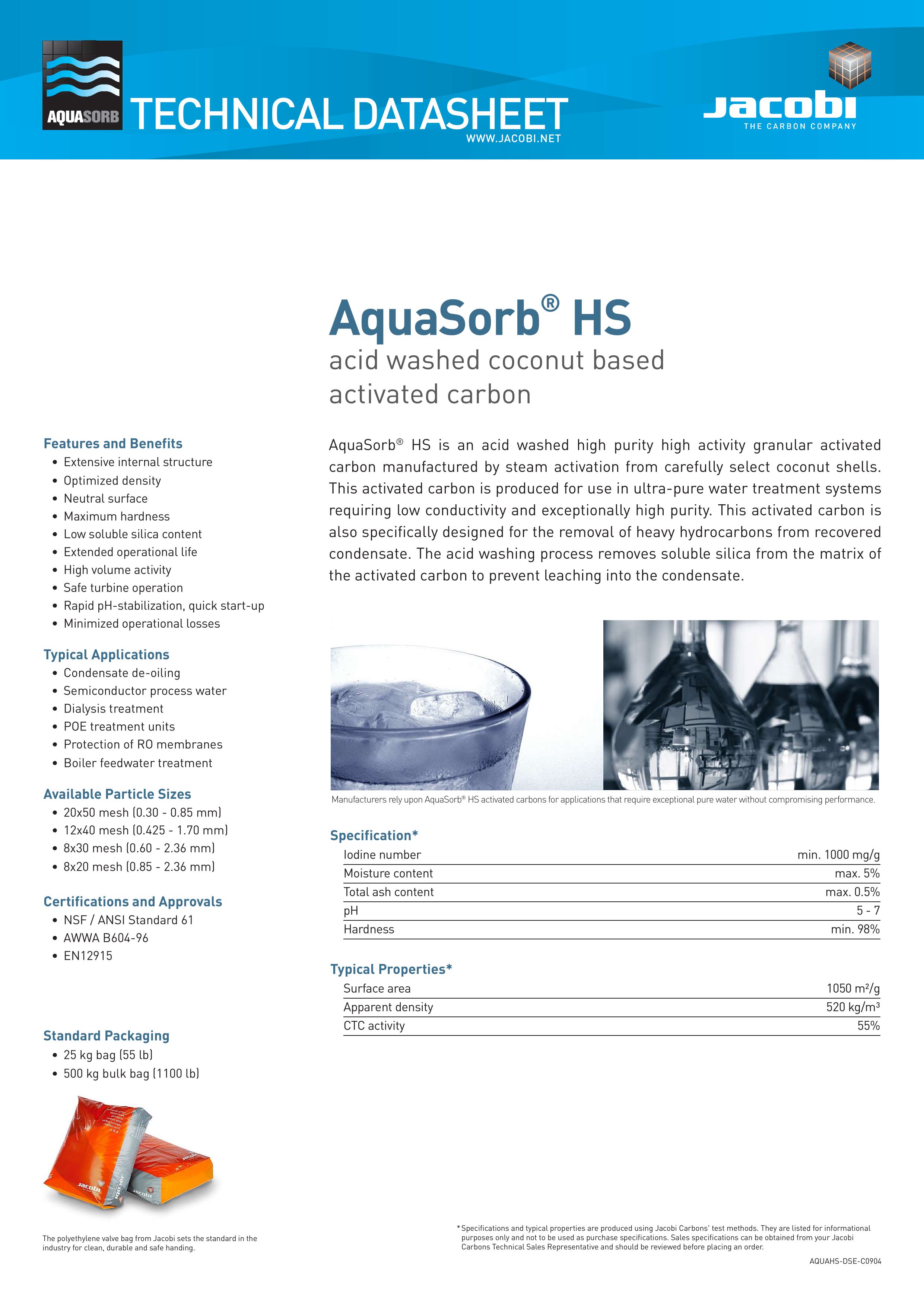 AquaSorb HS aktiivsüsi kookospähkli koortest, osakeste suurus 12x40 silma (0,425–1,70 mm). Happega pestud sordid erakordse tootepuhtuse tagamiseks, mis on loodud jookide ja ülipuhta vee rakenduste jaoks. AquaSorb® HS on happega pestud kõrge puhtusastmega kõrge aktiivsusega granuleeritud aktiivsüsi, mis on toodetud auruga aktiveerimise teel hoolikalt valitud kookospähkli koortest. See aktiivsüsi on toodetud kasutamiseks ülipuhastes veepuhastussüsteemides, mis nõuavad madalat juhtivust ja erakordselt kõrget puhtusastet. See aktiivsüsi on spetsiaalselt loodud ka raskete süsivesinike eemaldamiseks taaskasutatud kondensaadist. Happega pesemise protsess eemaldab aktiivsöe maatriksist lahustuva ränidioksiidi, et vältida selle leostumist kondensaati.