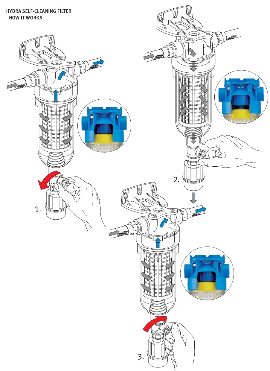 Rõhukadude korral loputatakse filter. Seda saab jälgida paigaldatud manomeetritega enne ja pärast filtrit. Läbipaistev korpus hõlbustab saastumise määra hindamist.