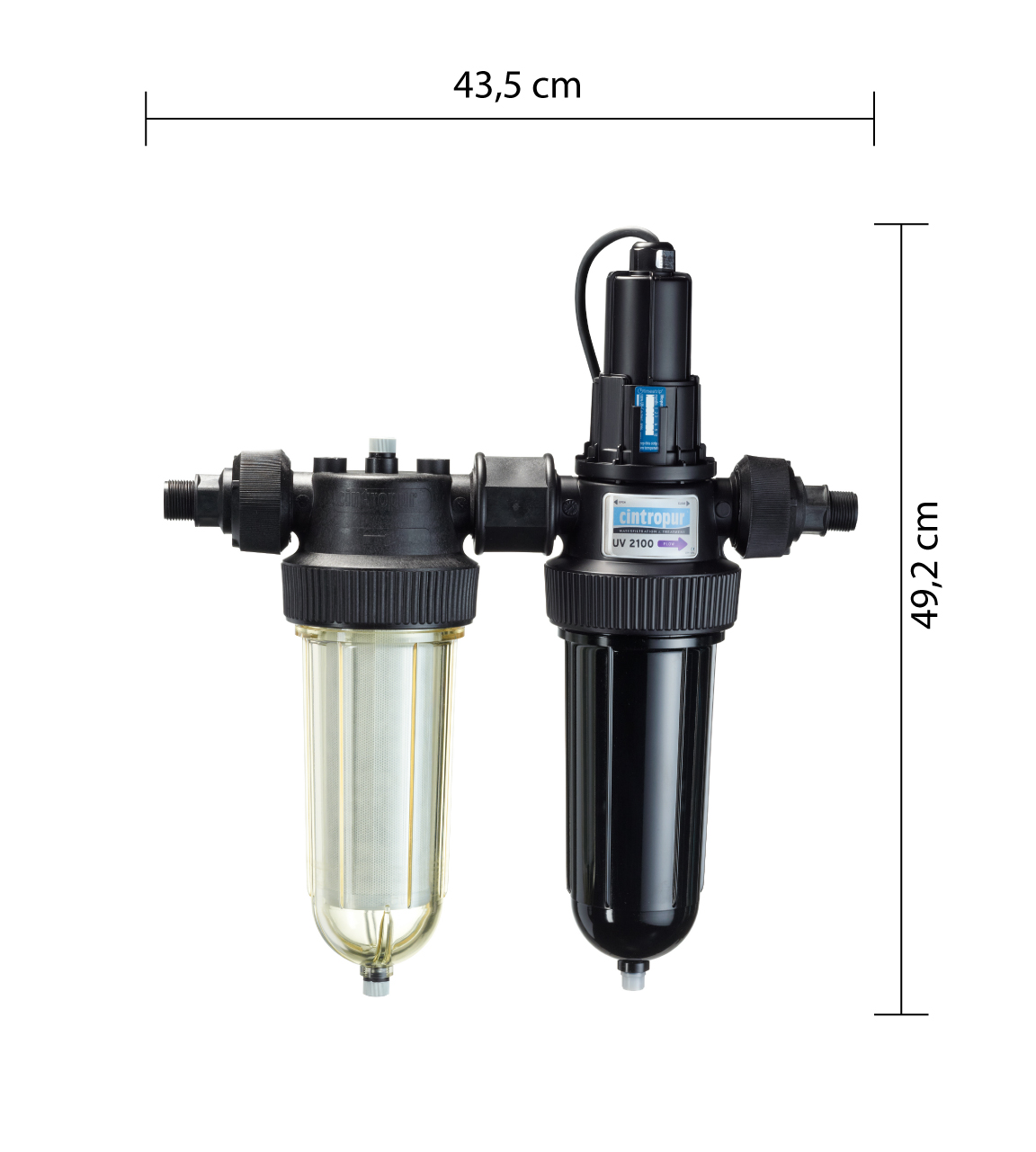 The filter system Cintropur DUO UV (25W), 3/4 "+ 1" (filtered and sterilized) is characterized by an ideal combination of mechanical filter and UV sterilization and is particularly well suited for food and drinking water applications as it is made entirely from synthetic material of first class Quality products.