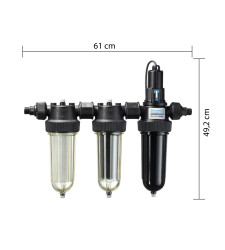 The filter system Cintropur TRIO UV (25W), 3/4 "+ 1" (Filtration, cleaning & sterilization) is characterized by an ideal combination of mechanical filter and UV sterilization and is particularly well suited for food and drinking water applications as it is made entirely from synthetic material of first class Quality products.
