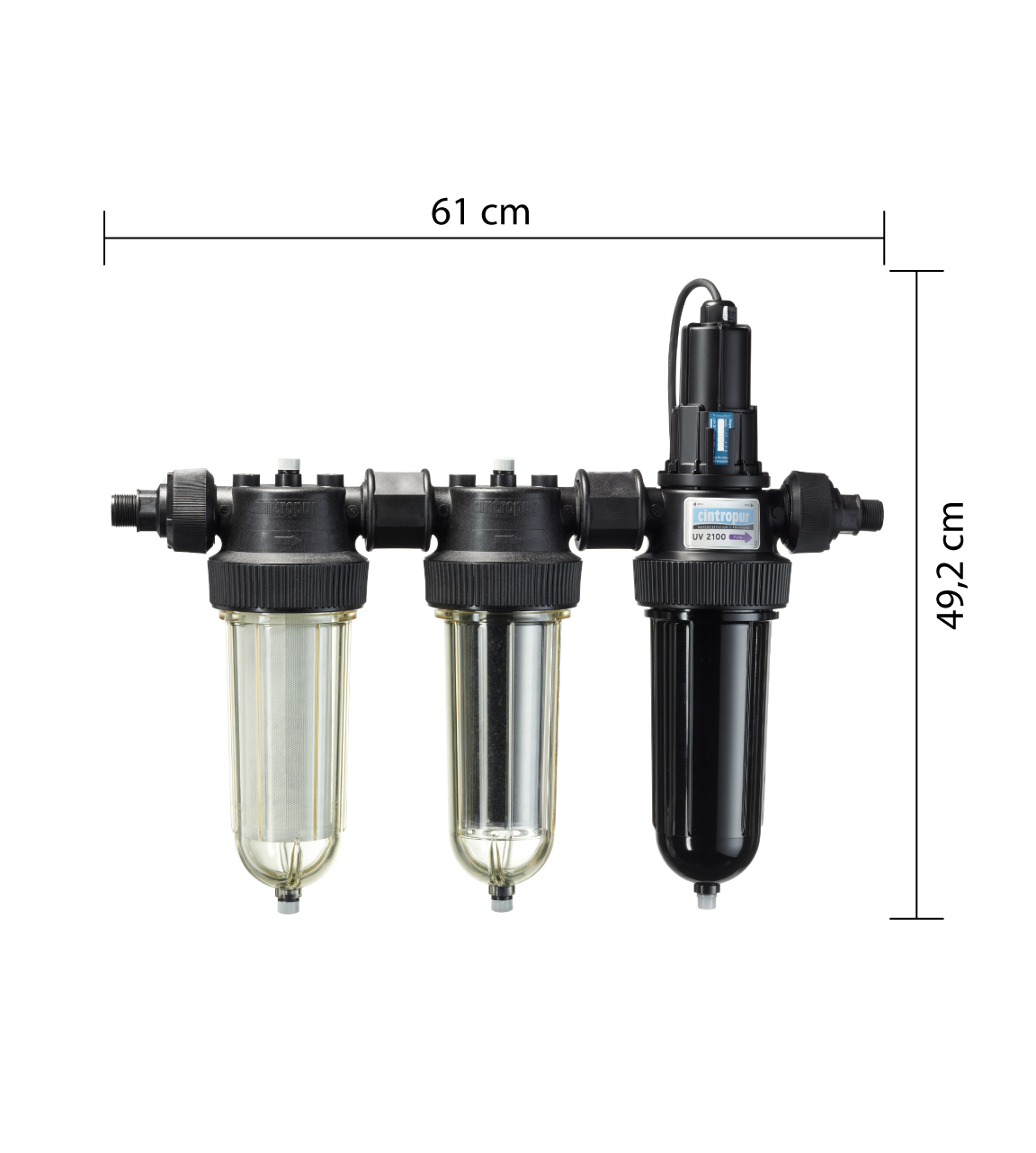 The filter system Cintropur TRIO UV (40W), 3/4 "+ 1" (Filtration, cleaning & sterilization) is characterized by an ideal combination of mechanical filter and UV sterilization and is particularly well suited for food and drinking water applications as it is made entirely from synthetic material of first class Quality products.