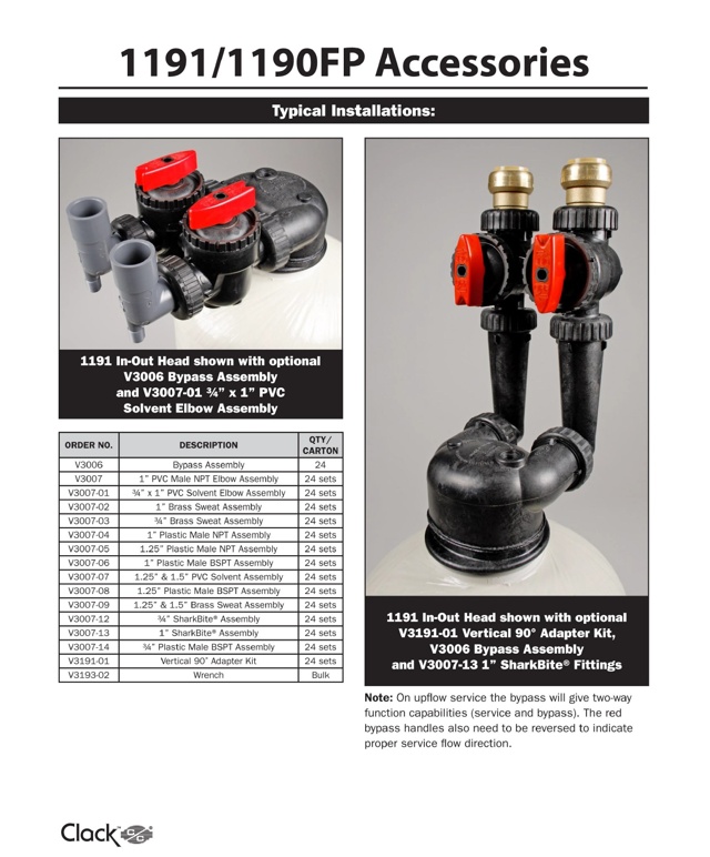 The 1” Head is fully ported to provide maximum flow rates.* The 1191 incorporates a standard 2½” tank connection and features parallel inlet and outlet ports to easily adapt to standard plumbing connections or Clack’s all-plastic, four-way bypass valve. A full line of fitting plumbing connection kits are available.