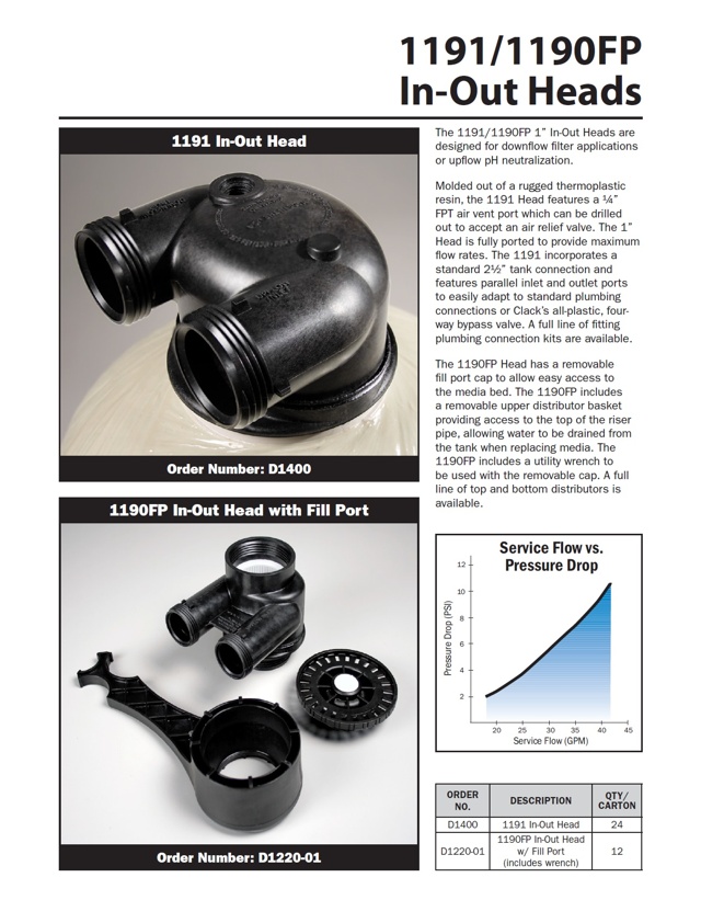 The 11911/1190FP 1’’ In-Out Heads are designed for downflow filter applications or upflow pH neutralization.