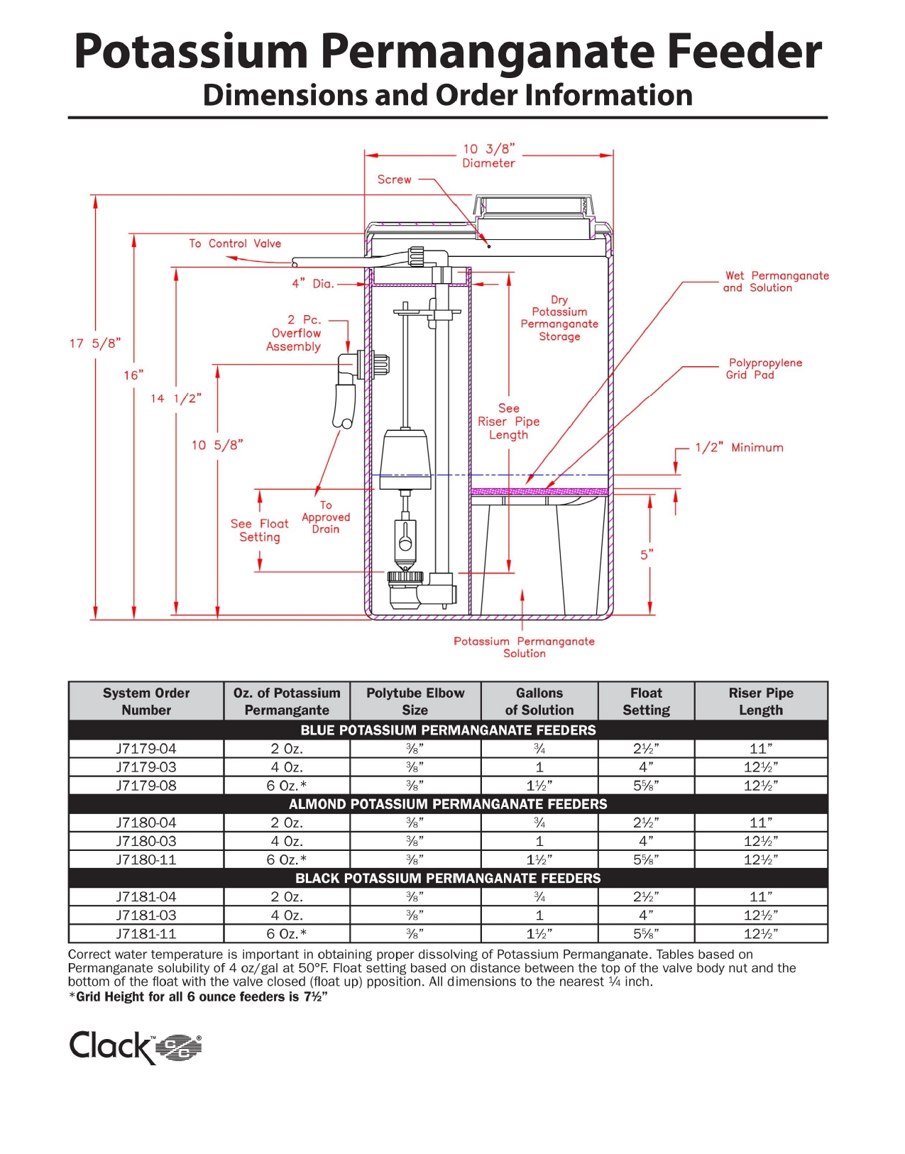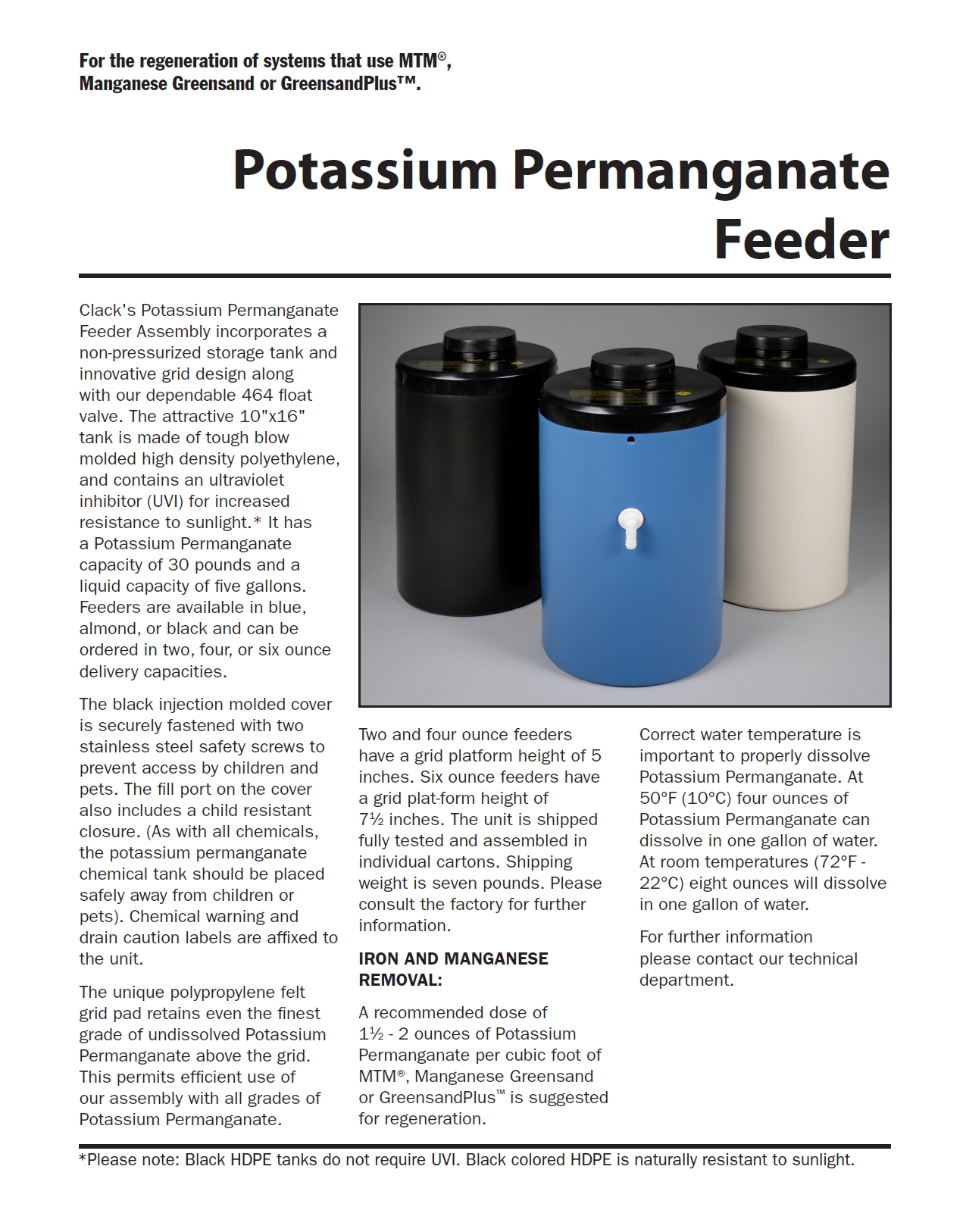 Clack's Potassium Permanganate Feeder Assembly incorporates a non-pressurized storage tank and innovative grid design along with our dependable 464 float valve. The attractive 10"x16" tank is made of tough blow molded high density polyethylene, and contains an ultraviolet inhibitor (UVI) for increased resistance to sunlight.* It has a Potassium Permanganate capacity of 13 kg and a liquid capacity of 18 liters. Feeders are available in blue, almond, or black and can be ordered in two, four, or six ounce delivery capacities.