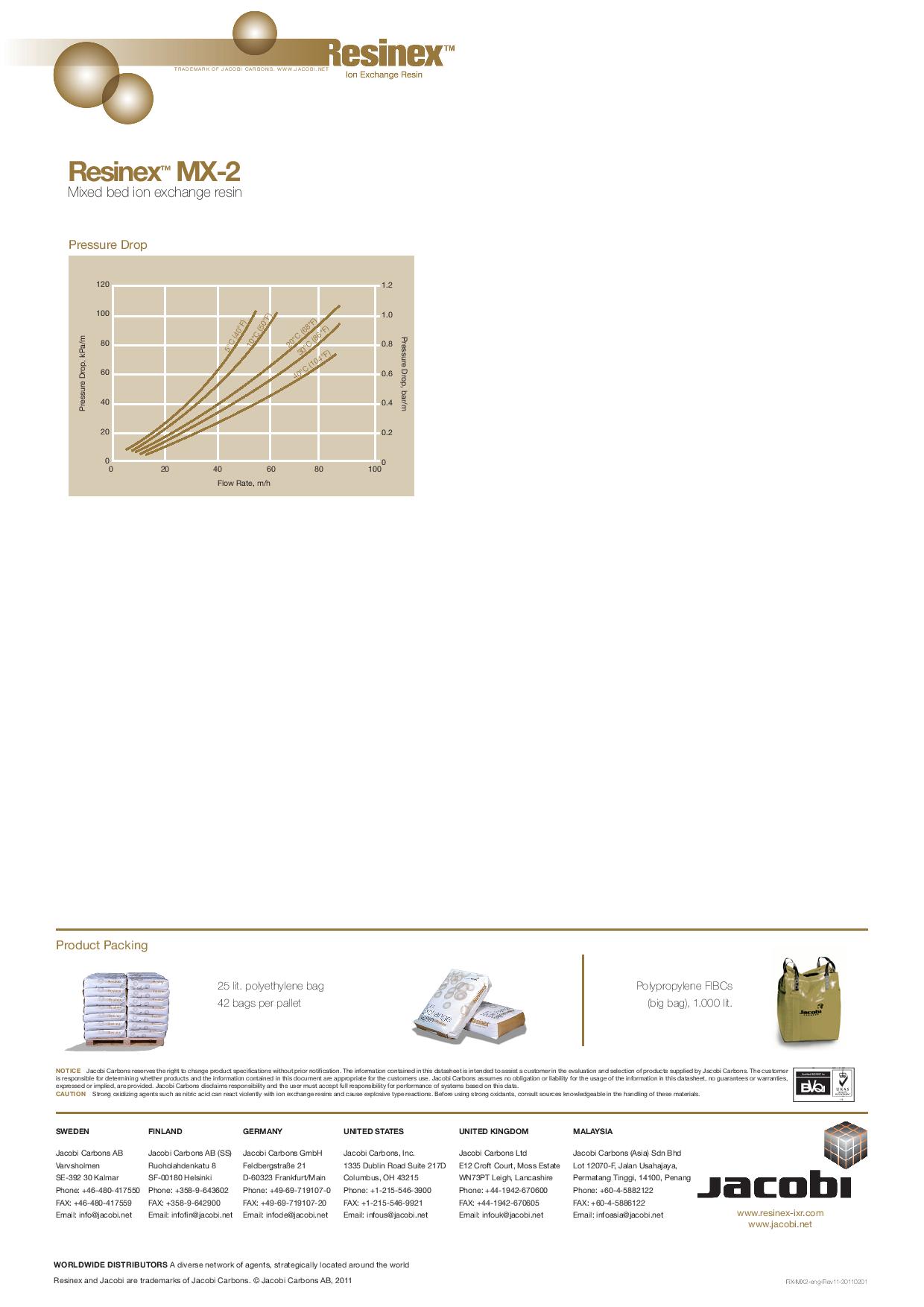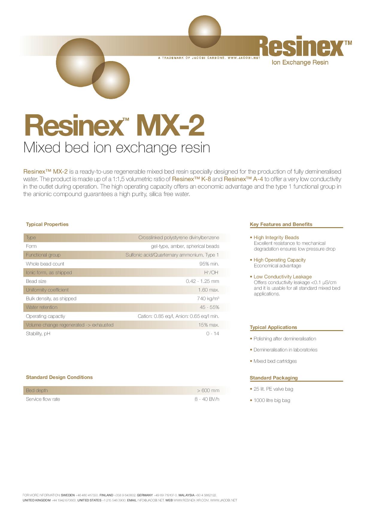 Resinex™ MX-2 on kasutusvalmis regenereeritav segavaigu segu, mis on spetsiaalselt välja töötatud täielikult demineraliseeritud vee tootmiseks. Toode koosneb Resinex™ K-8 ja Resinex™ A-4 segust mahulises vahekorras 1:1,5, mis tagab töö käigus väga madala väljuva vee elektrijuhtivuse. Kõrge töömaht annab majandusliku eelise ning anioonvaigu 1. tüüpi funktsionaalne rühm tagab kõrge puhtusastmega, ränivabast (silicavabast) veest.