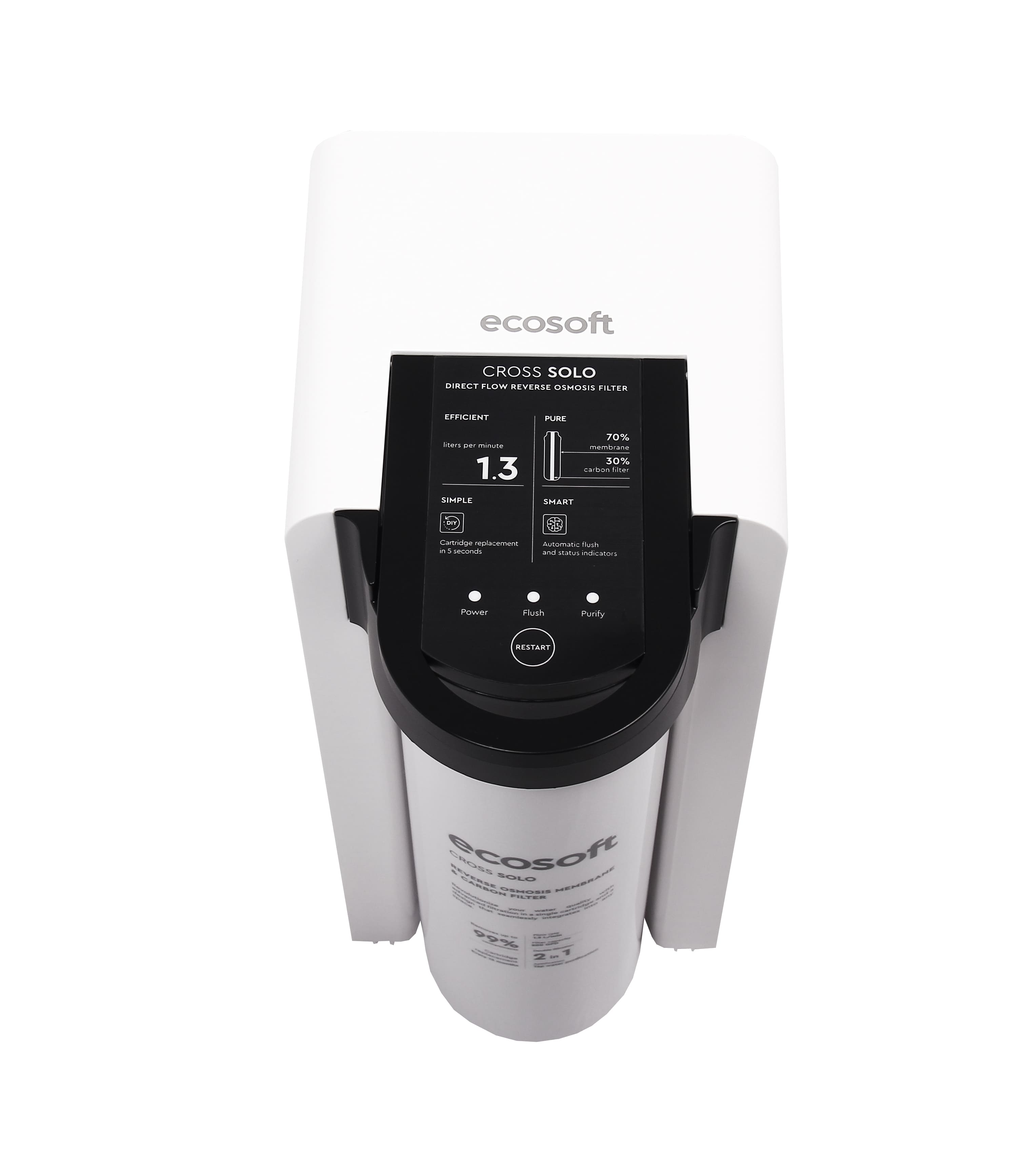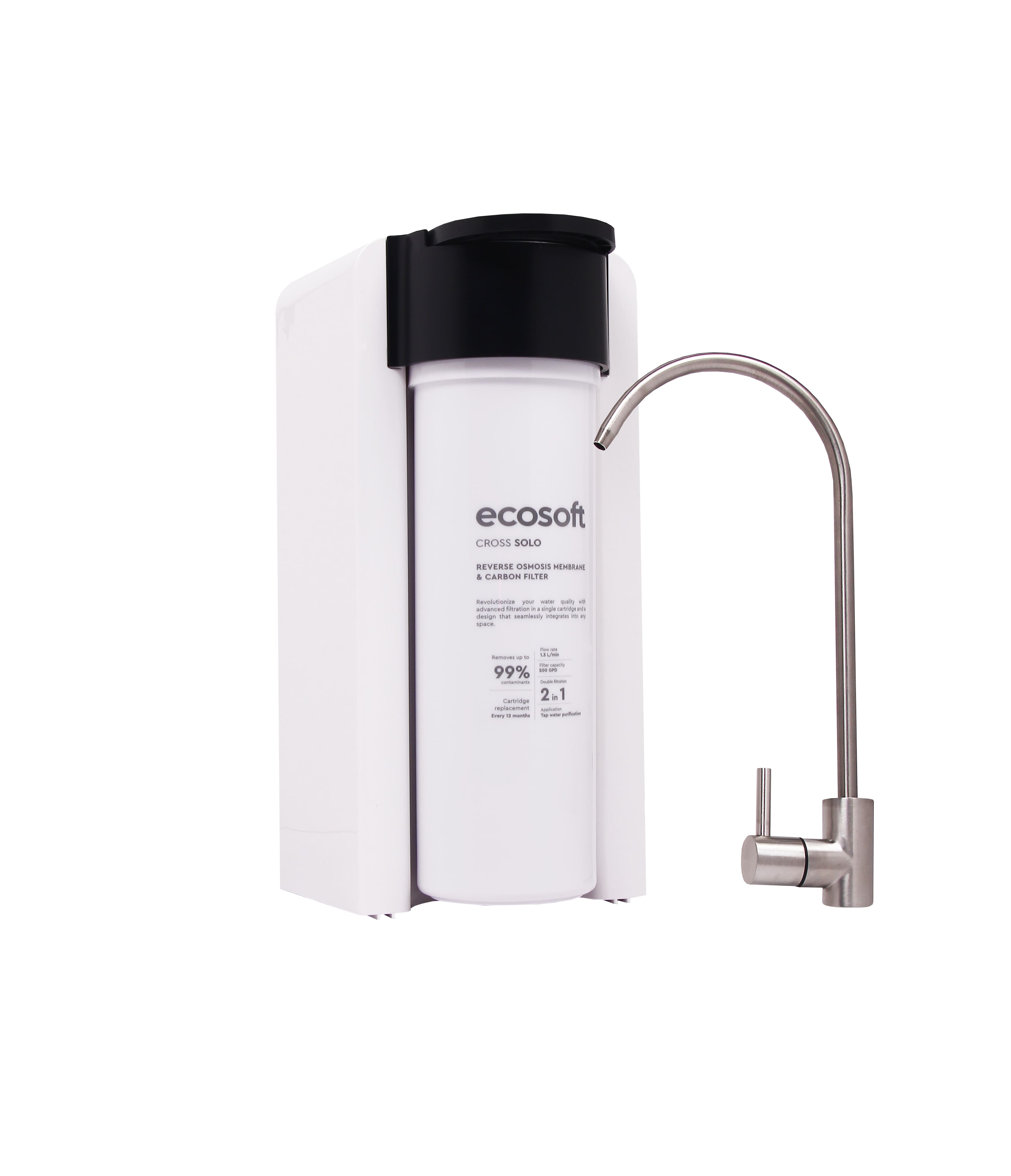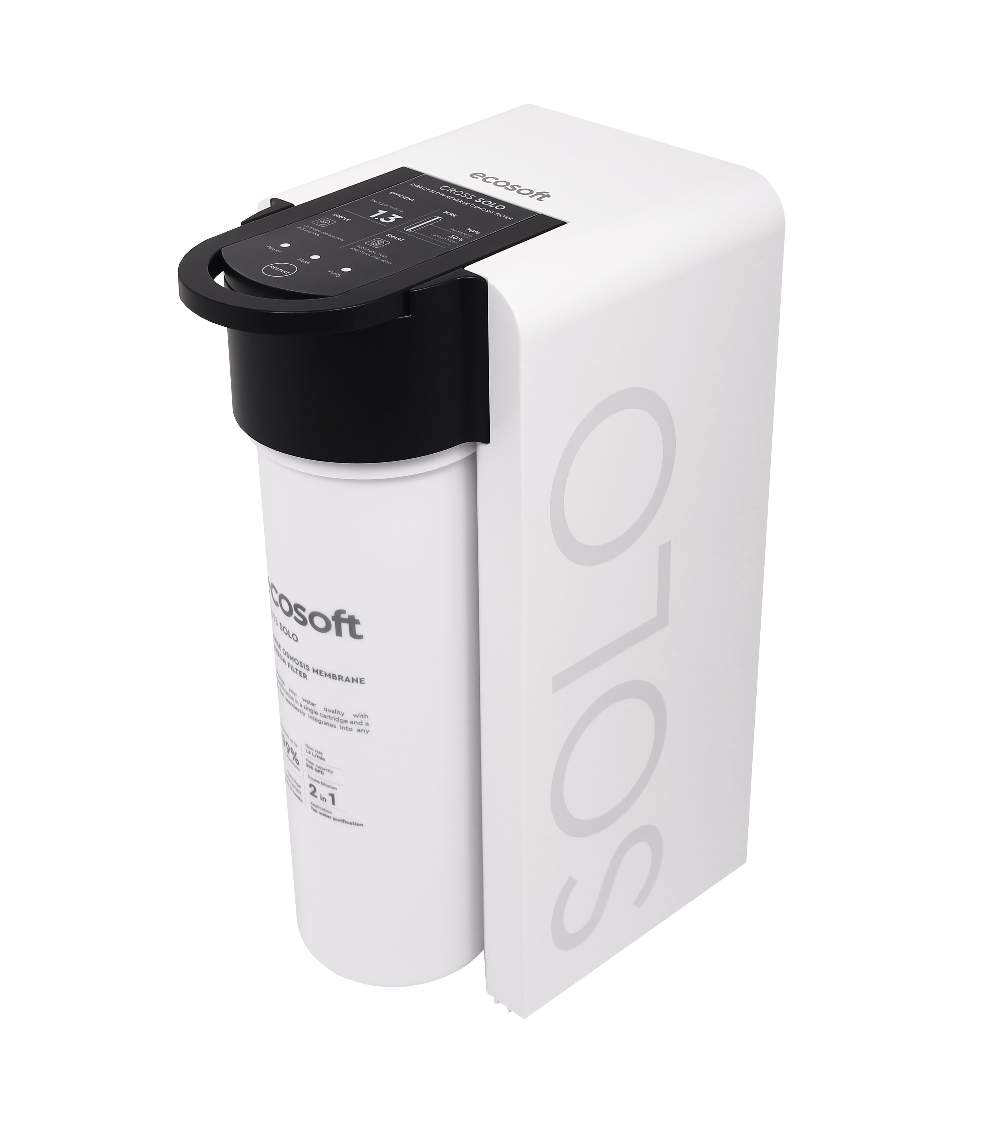 ECOSOFT Cross Solo kasutab täiustatud pöördosmoositehnoloogiat, et tagada kõrgekvaliteediline vee puhastamine. Süsteem töötab 2-in-1 vahetusfiltriga, mis ühendab RO membraani ja kookospõhisel aktiivsöel põhineva filtreerimise, eemaldades kuni 99% saasteainetest, sh bakterid, viirused ja PFAS.