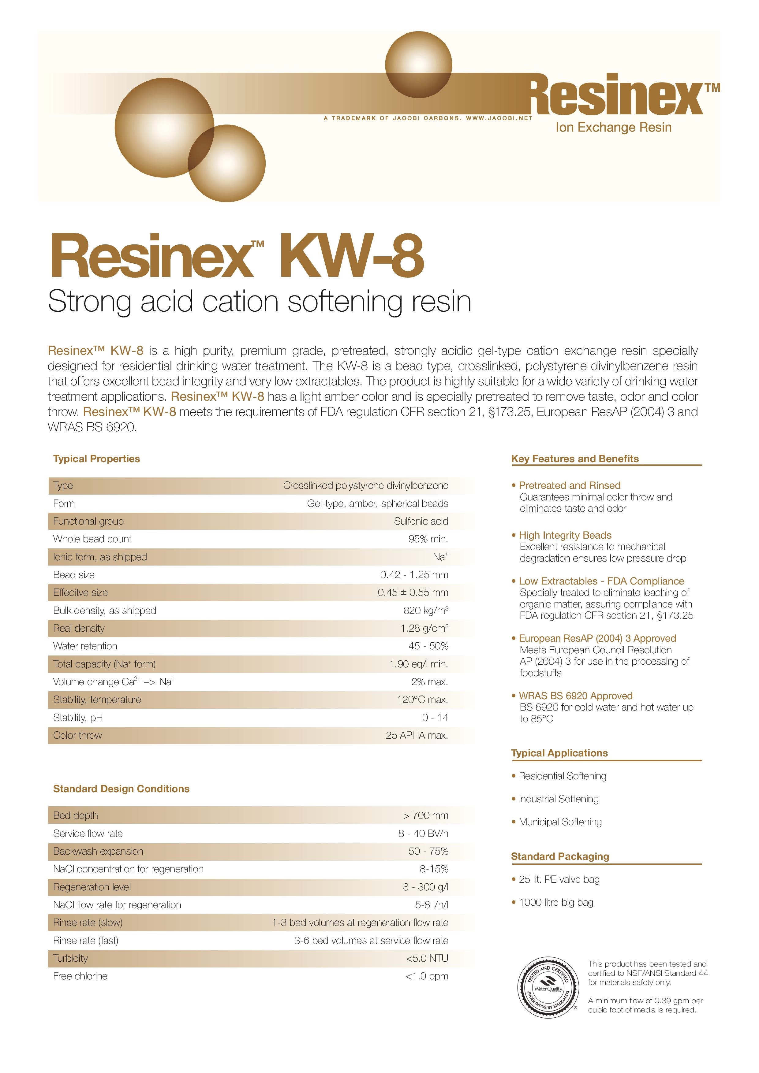 Resinex KW-8 is a high purity, premium grade, pretreated, strongly acidic gel-type cation exchange resin specially designed for residential drinking water treatment. The KW-8 is a bead type, cross-linked, polystyrene divinilbenzene resin that offers excellent bead integrity and very low extractable. The product is highly suitable for wide variety of drinking water treatment applications. REsinex KW-8 has a light amber color and is specially pretreated to remove taste, odor and color throw.