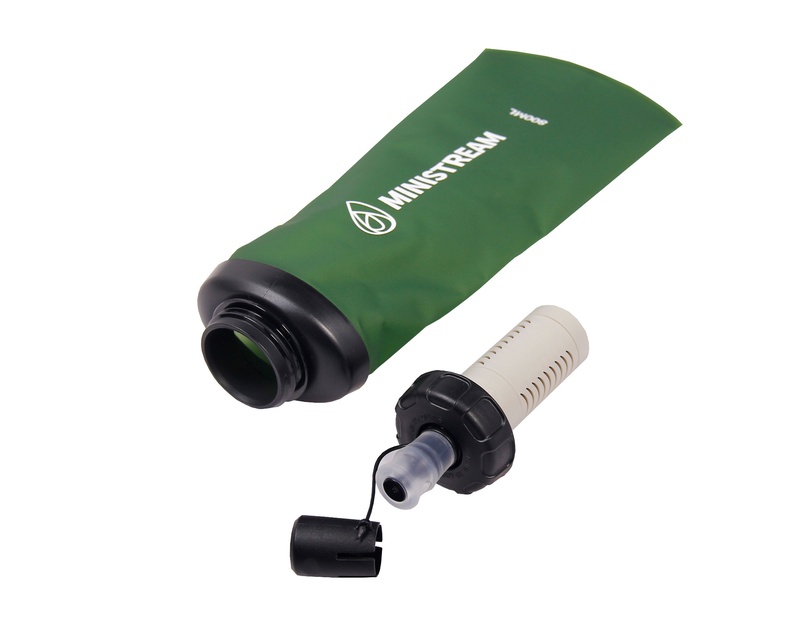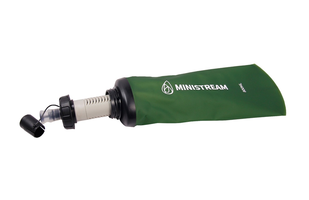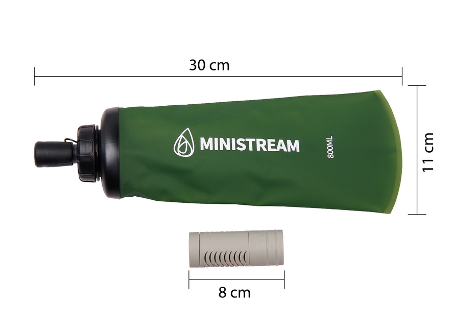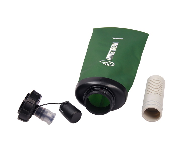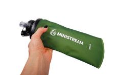 MINISTREAM veefilter–pudel (800 ml) on kerge, vastupidav ja korduvkasutatav lahendus ohutu joogivee tagamiseks matkadel, reisidel või hädaolukordades.