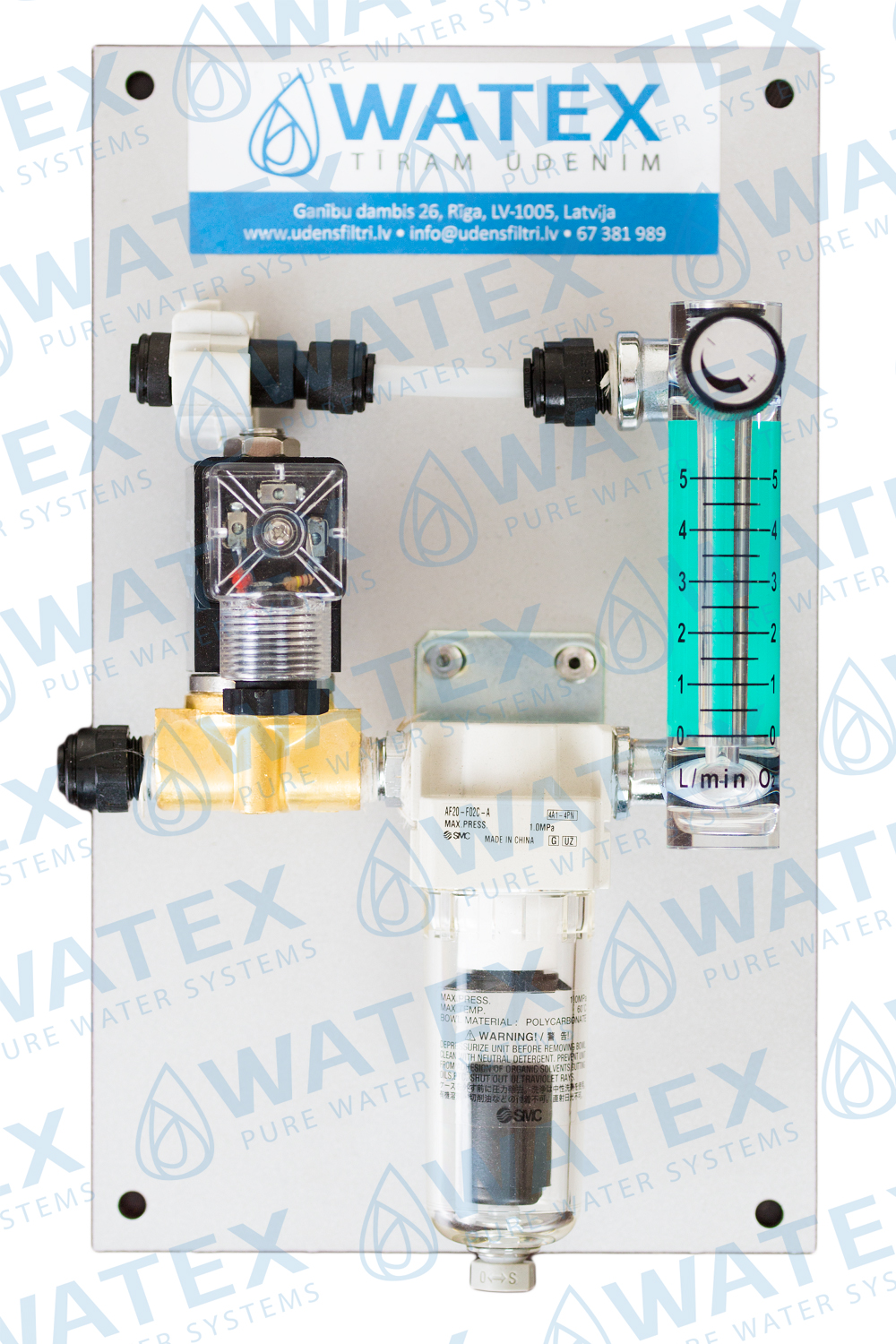 The air control system consists of a non-return valve, a rotometer (flow meter), a condensate trap and an electric valve.