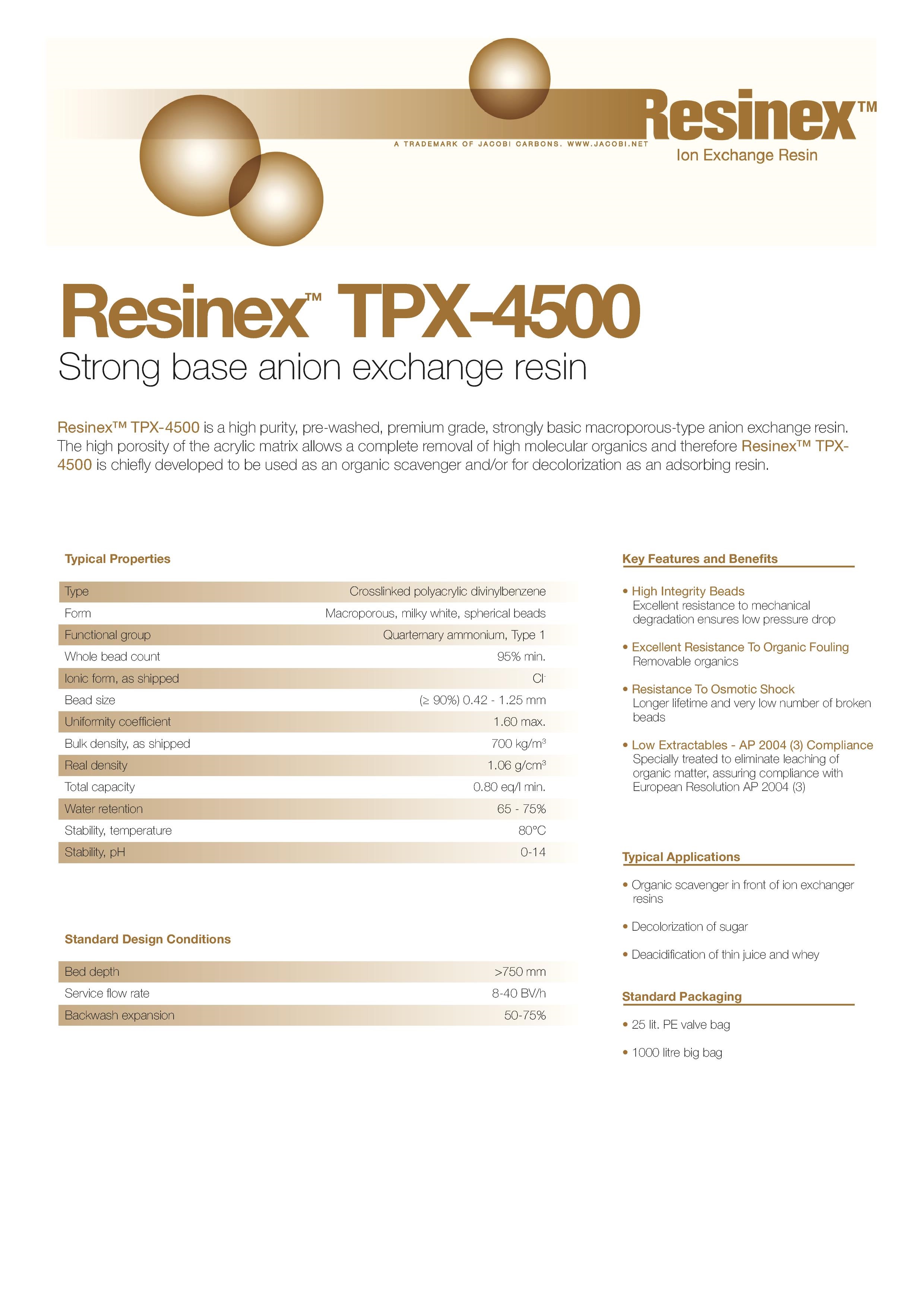 Resinex™ TPX-4500 on kõrge puhtusastmega, eelpestud, esmaklassiline, tugevalt aluseline makropoorset tüüpi anioonivahetusvaik.