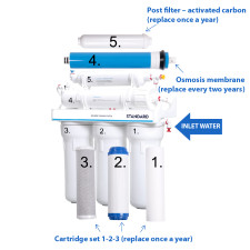 Polüpropüleenkassett (5 μm) – kaitseb pöördosmoosi membraani mehaaniliste osakeste (liiv, katlakivi, rooste ja sete) eest;