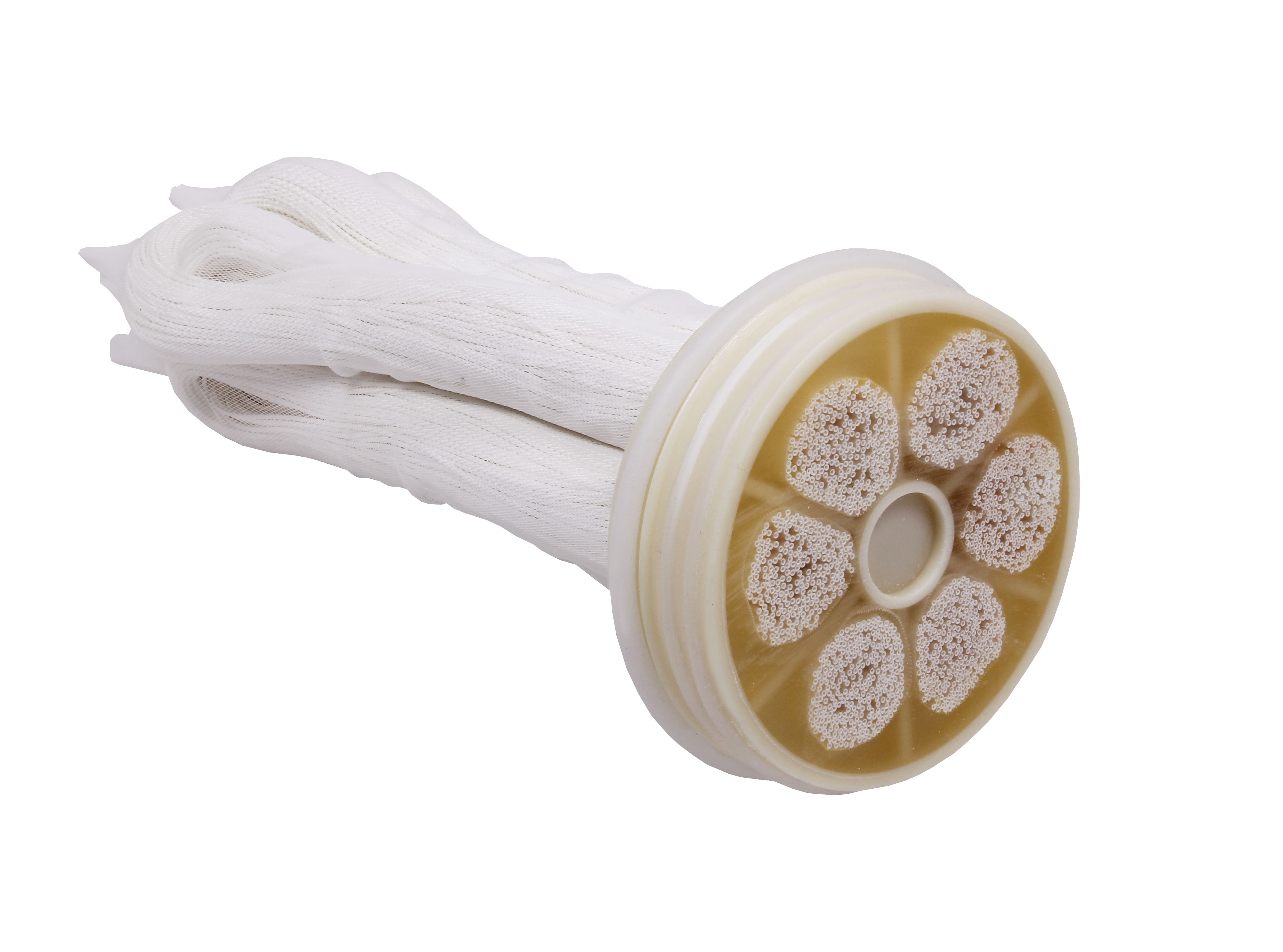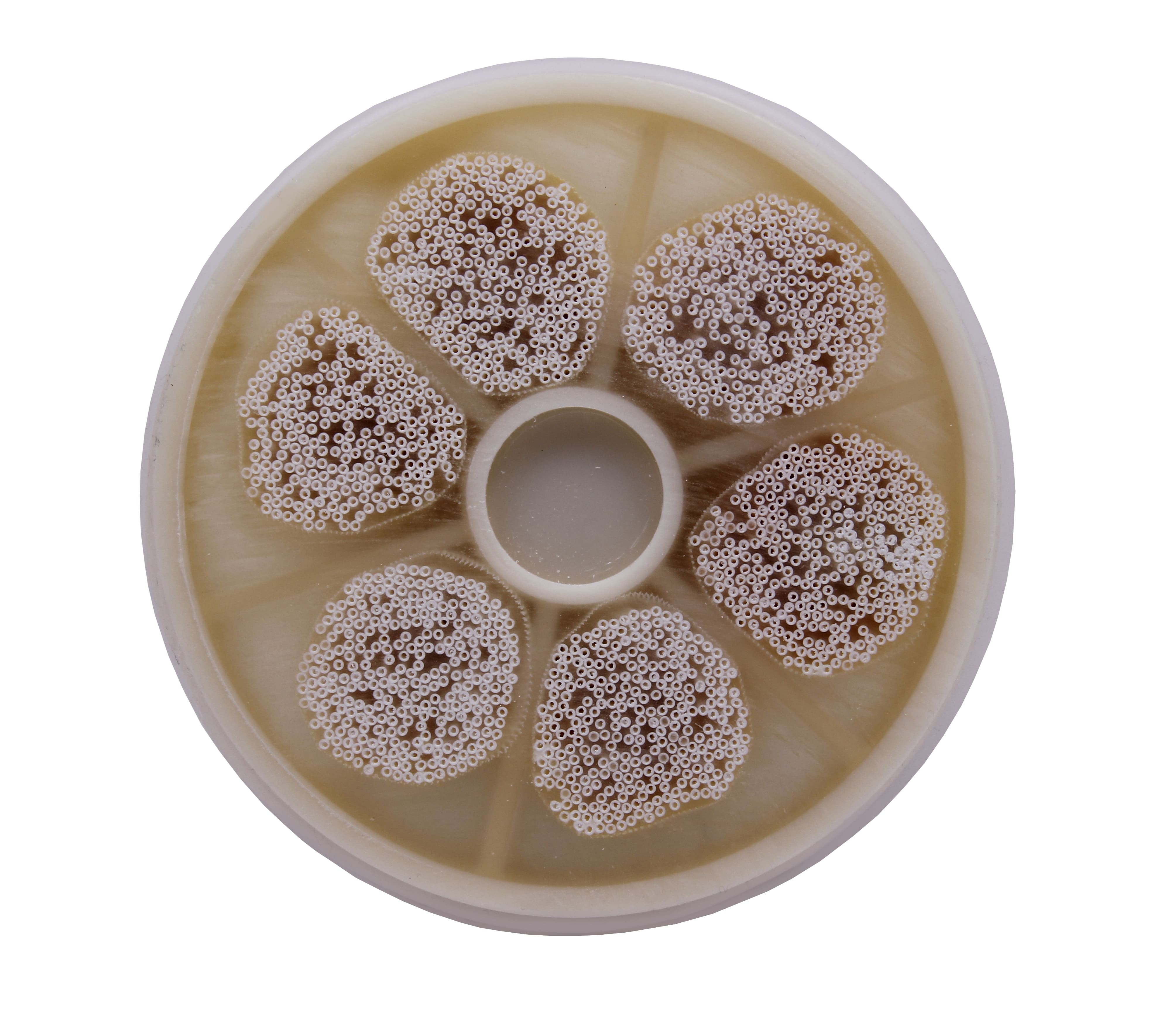 Kompaktne UF-moodul kuue kiudkimbuga, mis on hermeetiliselt valatud kollektori päisesse (epoksüvaluga). Töörežiim — vool kiu välispinnalt sisepinnale (väljast → sisse), tagades hägususe ja mikroorganismide eemaldamise madalal rõhul.