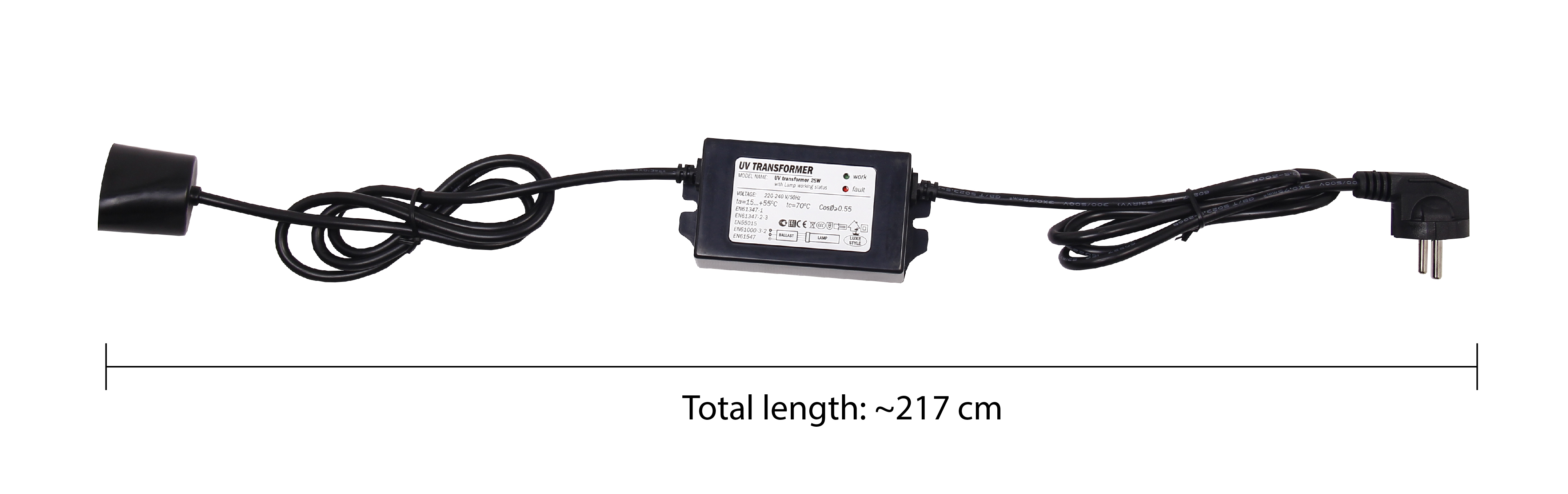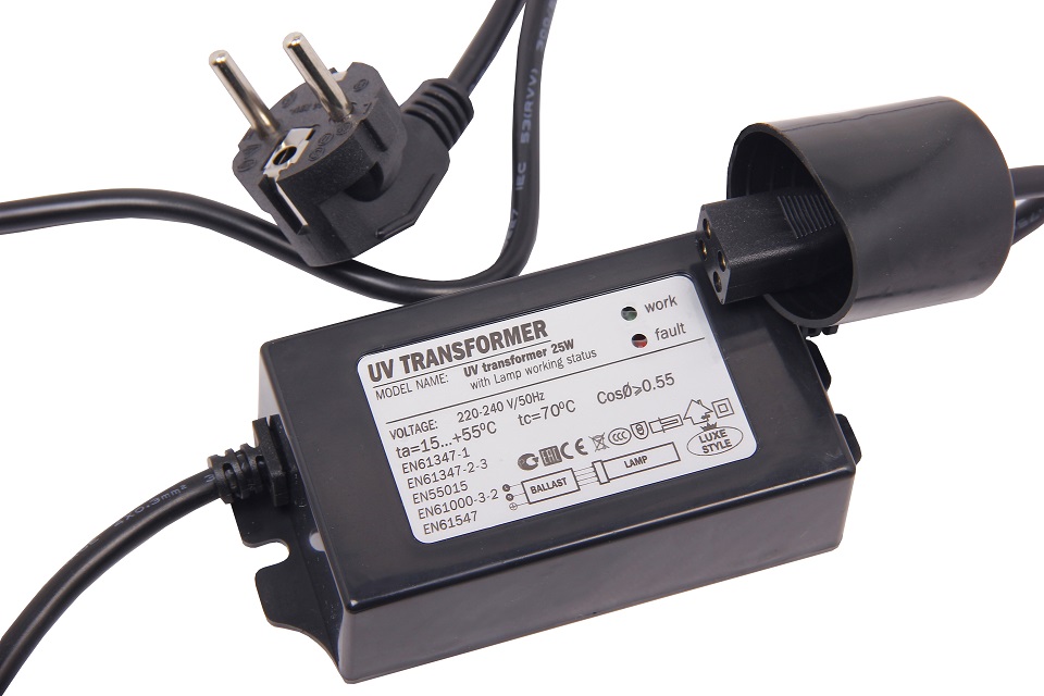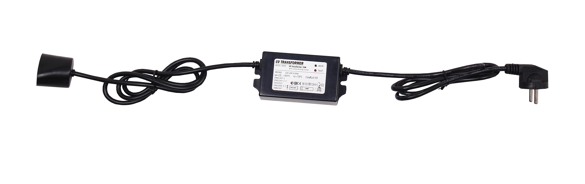 Sisend – 230 V AC. Väljund – 25 W UV lambile. Ainult siseruumides kasutamiseks.