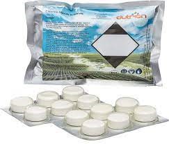 The frequency of application depends on the pool's load: water cleanliness, water temperature, the number of people, hygiene, etc., typically 2-6 times a month. The tablets should be added directly to the pool water (without using a skimmer). Even a 2-4 times increased dosage of Dutrion tablets in the pool is completely safe for health, but swallowing the tablets is hazardous to health! You can also dissolve the tablets in a 1-liter water bottle beforehand and pour the resulting solution into the pool. During the tablets' dissolution, cover the bottle with a lid to avoid inhaling the gas released by the tablets. If necessary, store the solution in a tightly closed glass container in a dark and cool place. If the solution accidentally gets into the eyes, rinse with water. Tablets can be added to the pool at any time, either after pool usage, for example, at night (when UV radiation is weak, the disinfectant effect is more effective), or during the day, for example, some time before (e.g., 60 minutes of water disinfection before visiting the pool). The tablets prevent microbiological contamination (bacteria, algae, etc.) but not mechanical pollution: leaves, dust, skin particles, insects, hair, etc. The mechanical pollution layer settled on the pool bottom and walls should be cleaned with a brush and removed with a special vacuum cleaner (or with a hose) or a robot. Dutrion is effective over a wide pH range from 4 to 10, and water pH control is not required. It is also not necessary to add an anti-algae agent as Dutrion is effective against algae. If necessary, a coagulant/flocculant can be added. Dutrion tablets are certified for use in organic production as they do not produce harmful breakdown products for humans, animals, and plants. The pool water can be used for watering plants (discharge water onto the lawn) and for animal watering. It does not cause eye and skin irritation (unlike hypochlorite and other chlorine-based preparations).