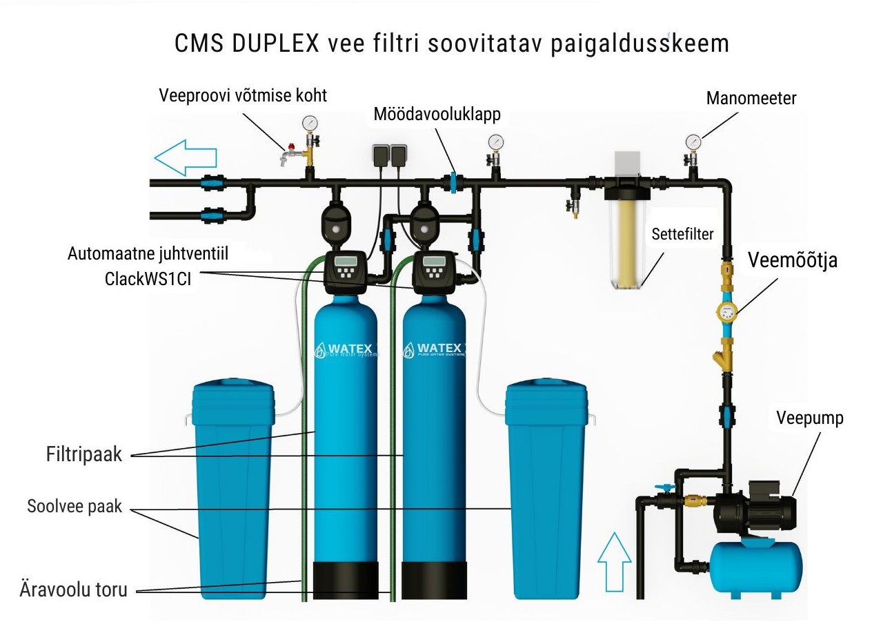 Lahendus veekvaliteedi parandamiseks suure veetarbimisega töökohtades või pideva veevarustuse ja püsiva veekvaliteedi tagamiseks pika aja jooksul on WATEX CMS DUPLEX veepehmendussüsteemid, mis pehmendavad vett ja eemaldavad rauda ioonvahetusvaikudega, mis on regenereeritakse soolvee (NaCl) lahusega.