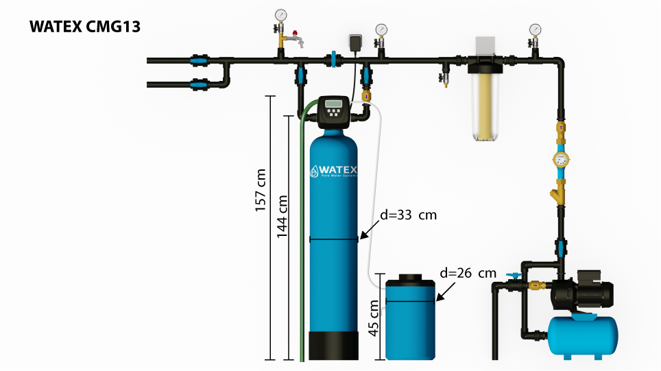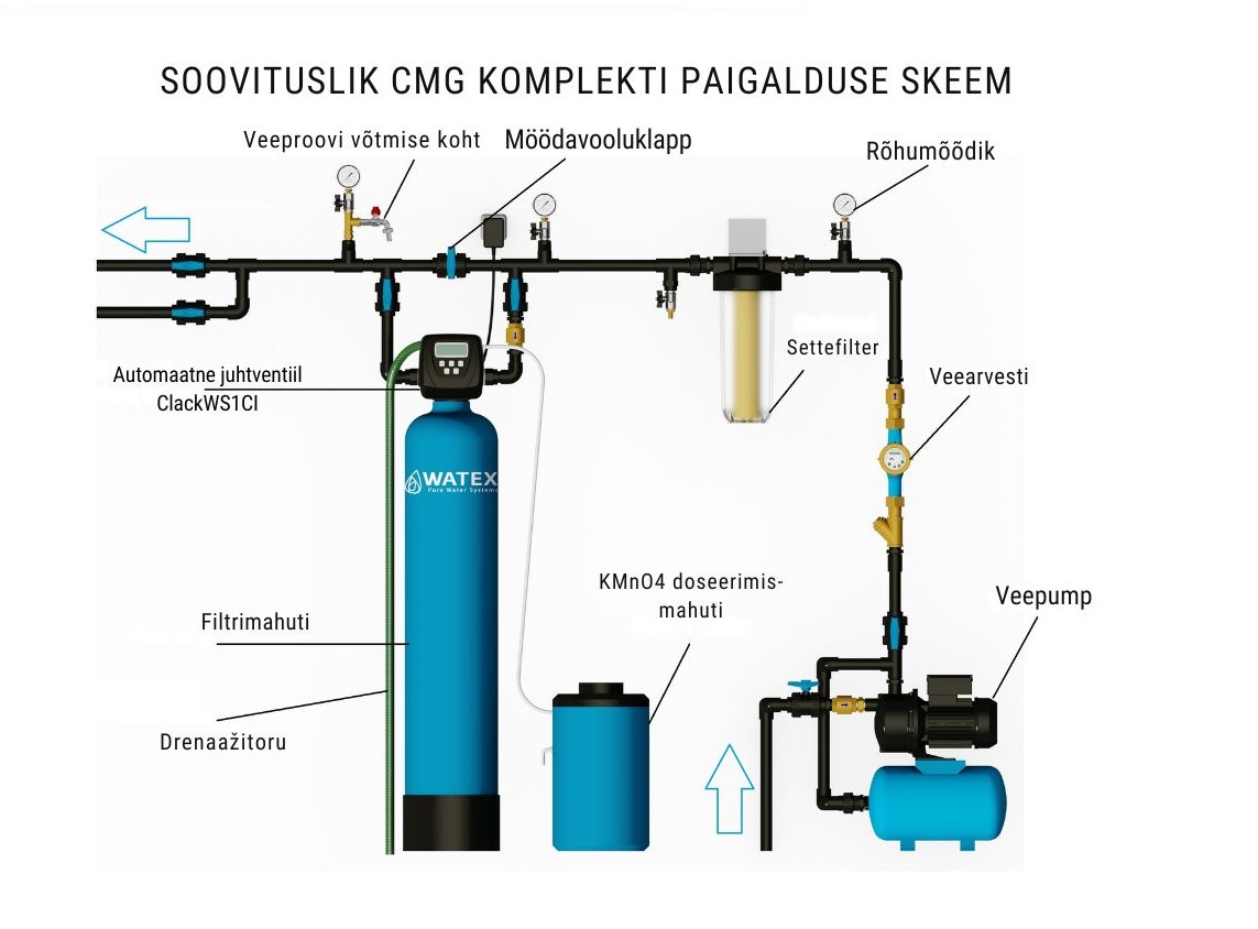 WATEX CMG seeria seadmed on tõhusad joogivee puhastusseadmed, mis vähendavad samal ajal vees rauda, mangaani ja hägusust. Raua eemaldamiseks kasutatakse reagenti (kaaliumpermanganaati). Vaatamata sellele, et reaktiivi kasutatakse, saab vett kasutada joomiseks ja muudeks inimeludeks.