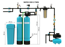 WATEX CMS TWIN seeria komplekt koosneb kahest filtripaagist, CLACK WS1CI TWIN juhtventiilist ja soolapaagist. Filtripaak on täidetud ioonivahetusvaigu (katioonvahetusvaigu) filtrimaterjaliga, mis vähendab vee karedust, ammoniaaki ja filtreerib rauda. Juhtventiil teostab seadmete automaatse regenereerimise. Soolapaak täidetakse vaigu taastamiseks reagendiga (NaCl, soolatabletid). Olenevalt vaigu kogusest ja vee kvaliteedist määratakse seadmele regeneratsioonide vahel töödeldava vee kogus. Üks filtripaak filtreerib, samal ajal kui teine ​​on ooterežiimis.