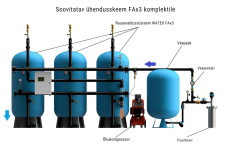Komplekt sisaldab filtrikolonni ja kompressorit – süsteem tarnitakse täielikult tehases kokkupanduna ning vajab ainult ühendamist vee, elektri ja kanalisatsiooniga.