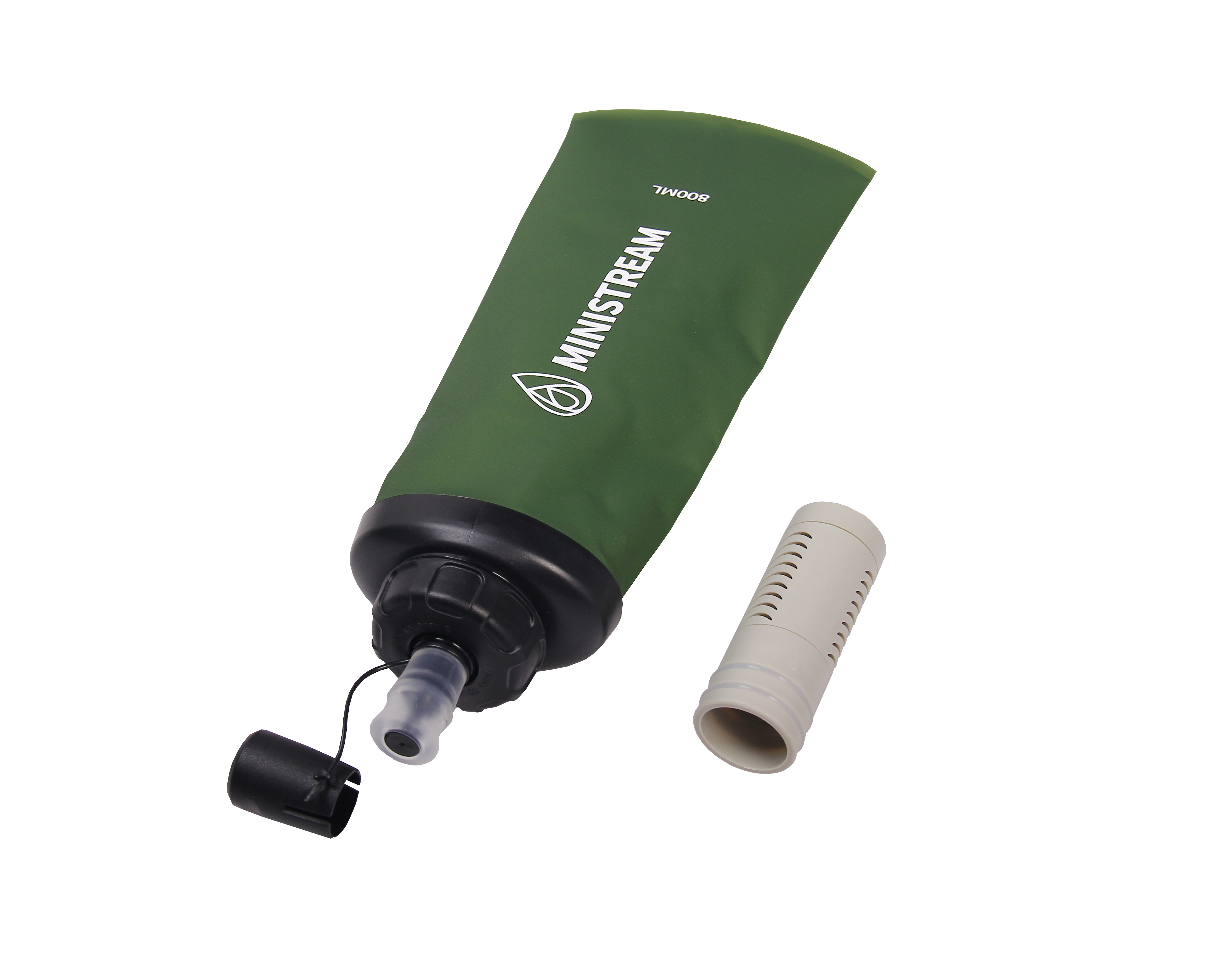 MINISTREAM veefilter–pudel (800 ml) on kerge, vastupidav ja korduvkasutatav lahendus ohutu joogivee tagamiseks matkadel, reisidel või hädaolukordades.