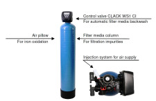WATEX CMB14 is automatic water filter for water treatment that can filtrate iron, manganese, odour, turbidity and arsenic, without the use of any reagents. It is based on the oxidation and filtration method. WATEX CMB consists of filter tank, automatic control valve and filtration media. Due to air pillow in the tank, substances that are in water are oxidized and filtered. Filter need drain and electricity connection. Filter is designed for high flow rate and low pressure loss. Rinsing water can be directly discharged to biological wastewater treatment plant.